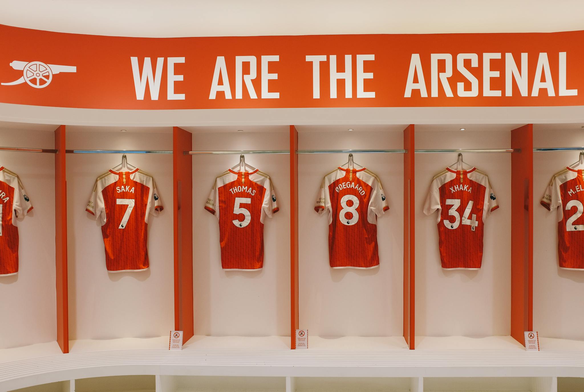 Arsenal FC jerseys on display in the Emirates Stadium locker room, London.